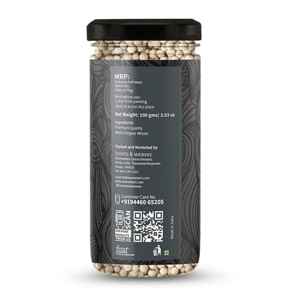 Both black pepper and white pepper are the berries of the same plant, piper nigrum. To obtain the slightly yellowish nearly globular white pepper (vellakurumulagu, safedmirch) ,the outer skin of the ripe or mature berries has to be removed. This homestead spice is collected and the outer skin is rinsed off bytraditional retting method. In retting the berries are soaked in water for a few days to soften their outer skin which is then rinsed off using running water. The washed berries are then sun-dried and packed with utmost care so that their flavor lasts longer.The flavor of white pepper is subtle and earthy compared to black pepper.White pepper also has some amazing medicinal properties. It is believed to be effective in treating digestive problems, dental issues, minor headaches, cold and cough. Capsaicin, an active ingredient in weight loss medicines is present in white pepper. Being a rich source of minerals like magnesium, copper and manganese, it also helps in boosting bone strength