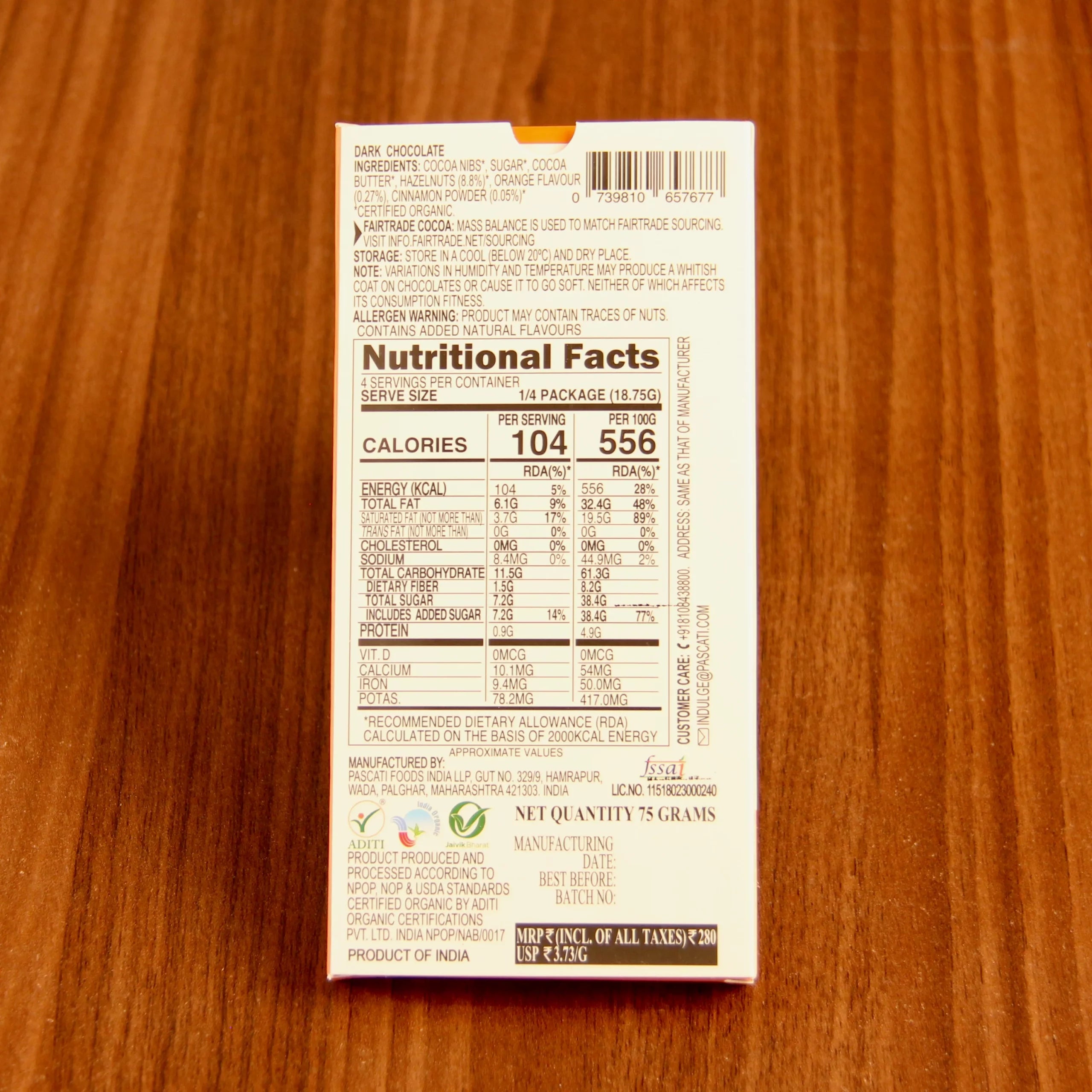 Ingredients: Cocoa Nibs, Sugar, Cocoa Butter, Hazelnut (8.8%), Orange Flavour (0.27%), Cinnamon Powder (0.05%)