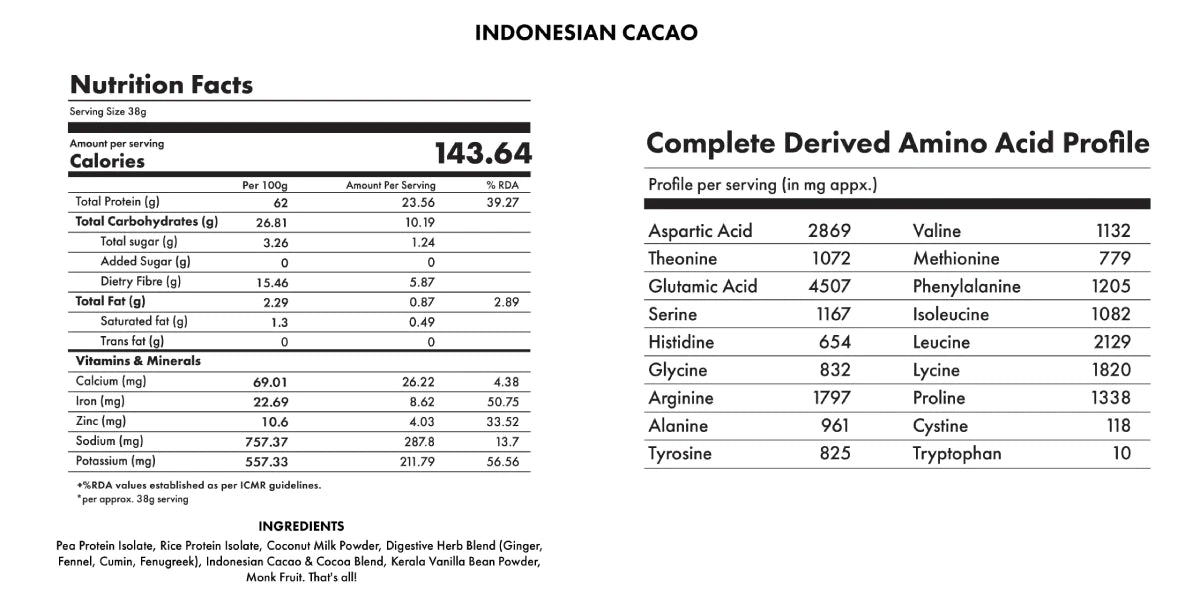 Ingredients: Pea Protein Isolate, Rice Protein Isolate, Coconut Milk Powder, Digestive Herb Blend (Ginger, Fennel, Cumin, Fenugreek), Indonesian Cacao & Cocoa Blend, Kerala Vanilla Bean Powder, Monk Fruit
