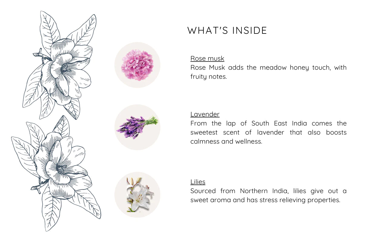 A perfect afternoon in a flower field, where the sun is grateful, cutting cross your hair and playing with your shadow. You are lost in time, sauntering carelessly, picking daffodils, lilies, and violets and letting them flirt in your basket. Welcome to the world of Daydream. Made with the sweetest flowers and the strongest love.