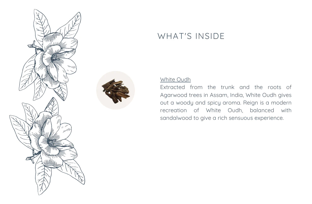 How does it feel to wear a privilege that was once reserved only for the royalty? A natural rarity, the woody and balsamic fragrance of White Oud, comes from the tropical Agar trees in Assam India. Roll it on to bask in the regal glory of India, reminding you every day that you were born to REIGN.