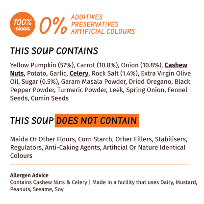 Yellow Pumpkin (57.3%), Carrot (10.8%), Onion (10.8%), Cashew Nuts, Potato, Garlic, Celery, Rock Salt (1.4%), Extra Virgin Olive Oil, Sugar (0.57%), Garam Masala Powder, Dried Oregano, Black Pepper Powder, Turmeric Powder, Leeks, Spring Onion, Fennel Seeds, Cumin Seeds
